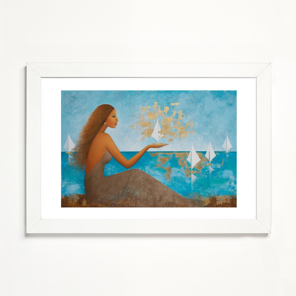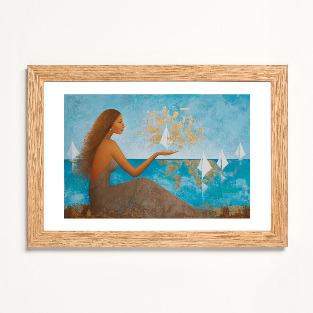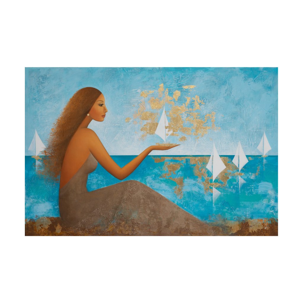 Obraz pracuje s archetypem ženy jako tiché pozorovatelky i tvůrkyně směru. Tyrkysové a modré plochy moře a nebe evokují hloubku a plynutí času, zatímco zlaté struktury vnášejí do kompozice světlo, hodnotu a pocit výjimečnosti. Bílé plachetnice působí křehce, ale zároveň symbolizují pohyb a otevřenost změnám. Obraz kombinující hladké přechody s výraznou strukturou se hodí především do obývacího prostoru, klidové zóny nebo reprezentativní kanceláře, kde vytvoří atmosféru elegance a vnitřního klidu.