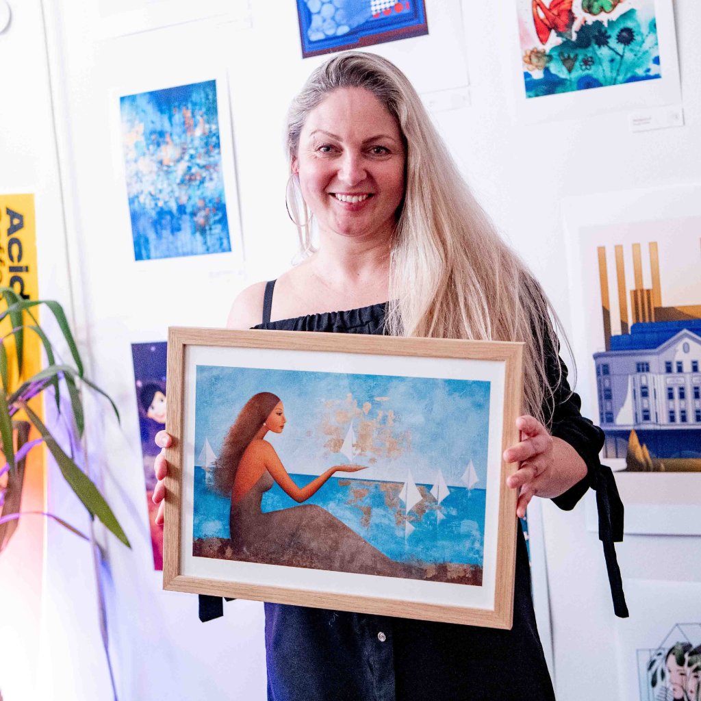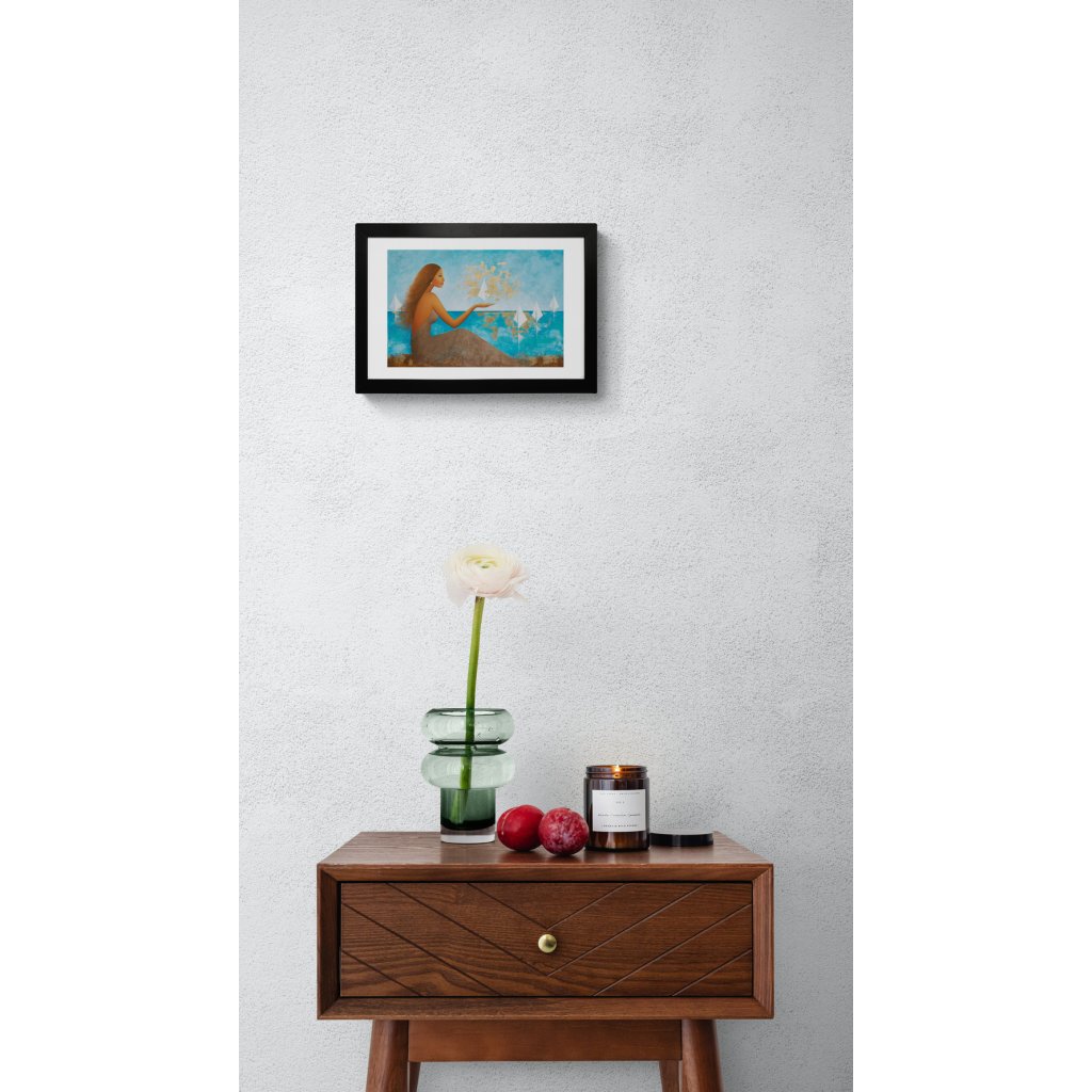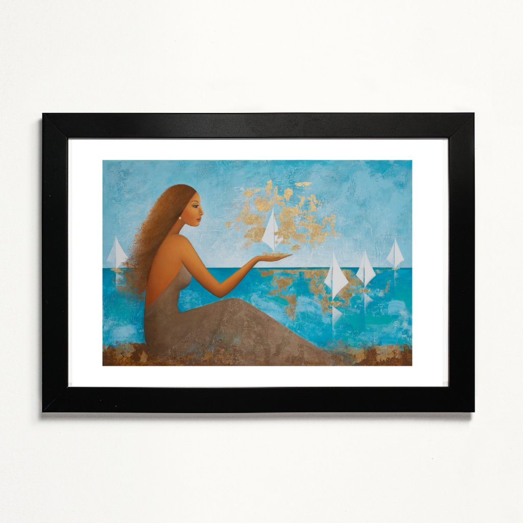 Obraz pracuje s archetypem ženy jako tiché pozorovatelky i tvůrkyně směru. Tyrkysové a modré plochy moře a nebe evokují hloubku a plynutí času, zatímco zlaté struktury vnášejí do kompozice světlo, hodnotu a pocit výjimečnosti. Bílé plachetnice působí křehce, ale zároveň symbolizují pohyb a otevřenost změnám. Obraz kombinující hladké přechody s výraznou strukturou se hodí především do obývacího prostoru, klidové zóny nebo reprezentativní kanceláře, kde vytvoří atmosféru elegance a vnitřního klidu.