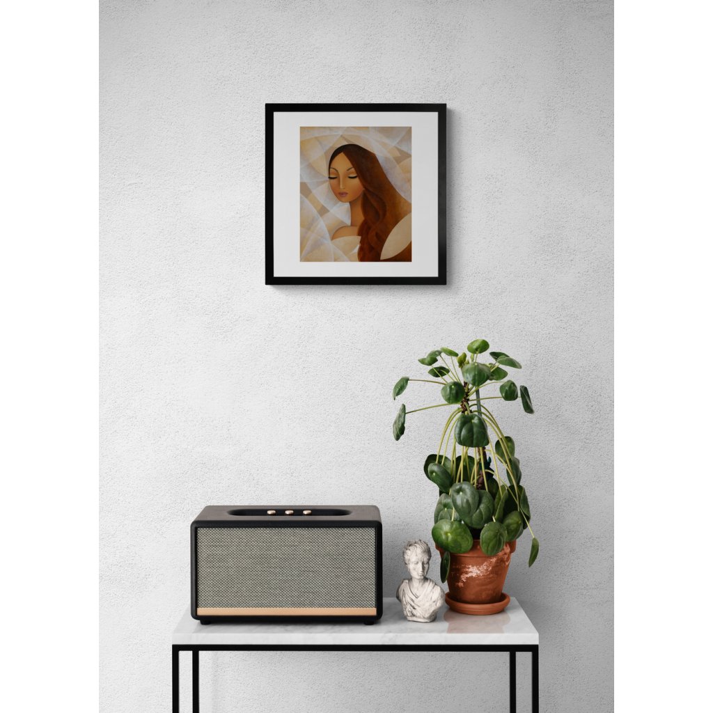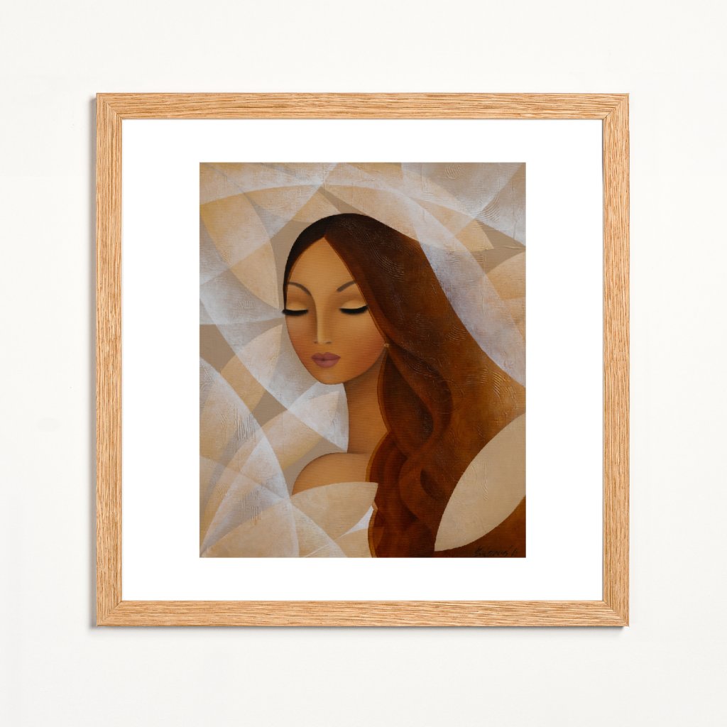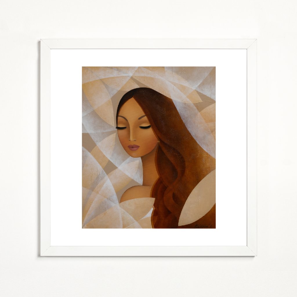 Dílo stojí na vyváženosti geometrických tvarů a jemně stylizované ženské tváře. Paleta béžové, slonovinové a teplých hnědých odstínů vytváří pocit stability, ticha a kultivovanosti. Uzavřené oči postavy posilují dojem vnitřního soustředění. Ideální volba do minimalistických interiérů, kanceláří, galerijních prostor a míst, kde má obraz působit klidně, ale zároveň sebevědomě.