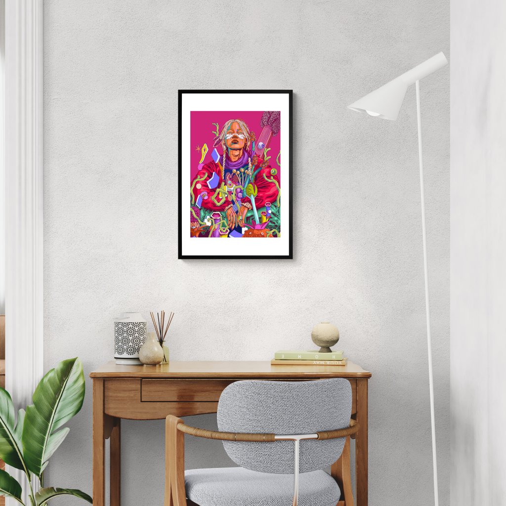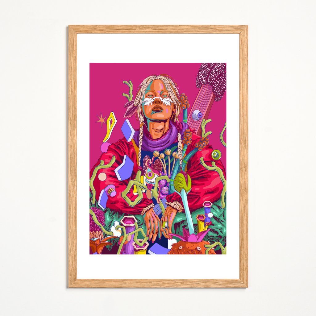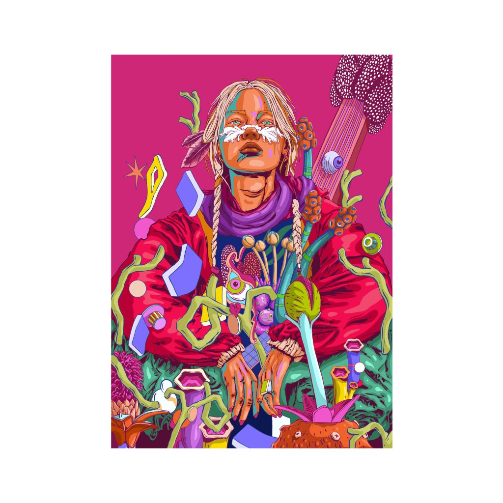 Odvážná kompozice v dominantní purpurové, červené a tyrkysové barvě zachycuje ženu, která jako novodobá šamanka vládne surrealistické flóře kolem sebe. Každý detail, od pomalované tváře přes splétané copy až po fantastické rostliny a abstraktní levitující objekty, vypráví příběh o propojení starověké mystiky s futuristickou estetikou. Obraz je nabitý sebevědomím a klidnou silou, která přinutí diváka zastavit a zkoumat tento podivuhodný svět.