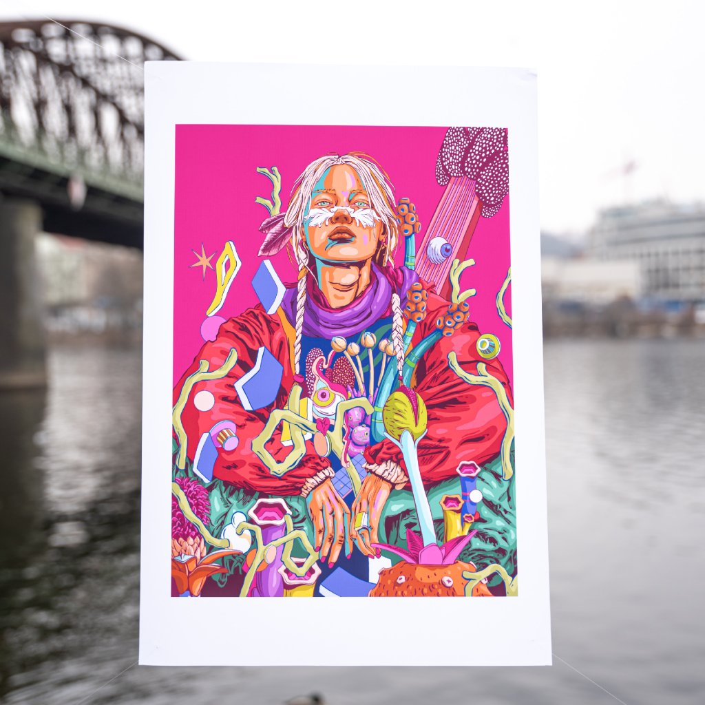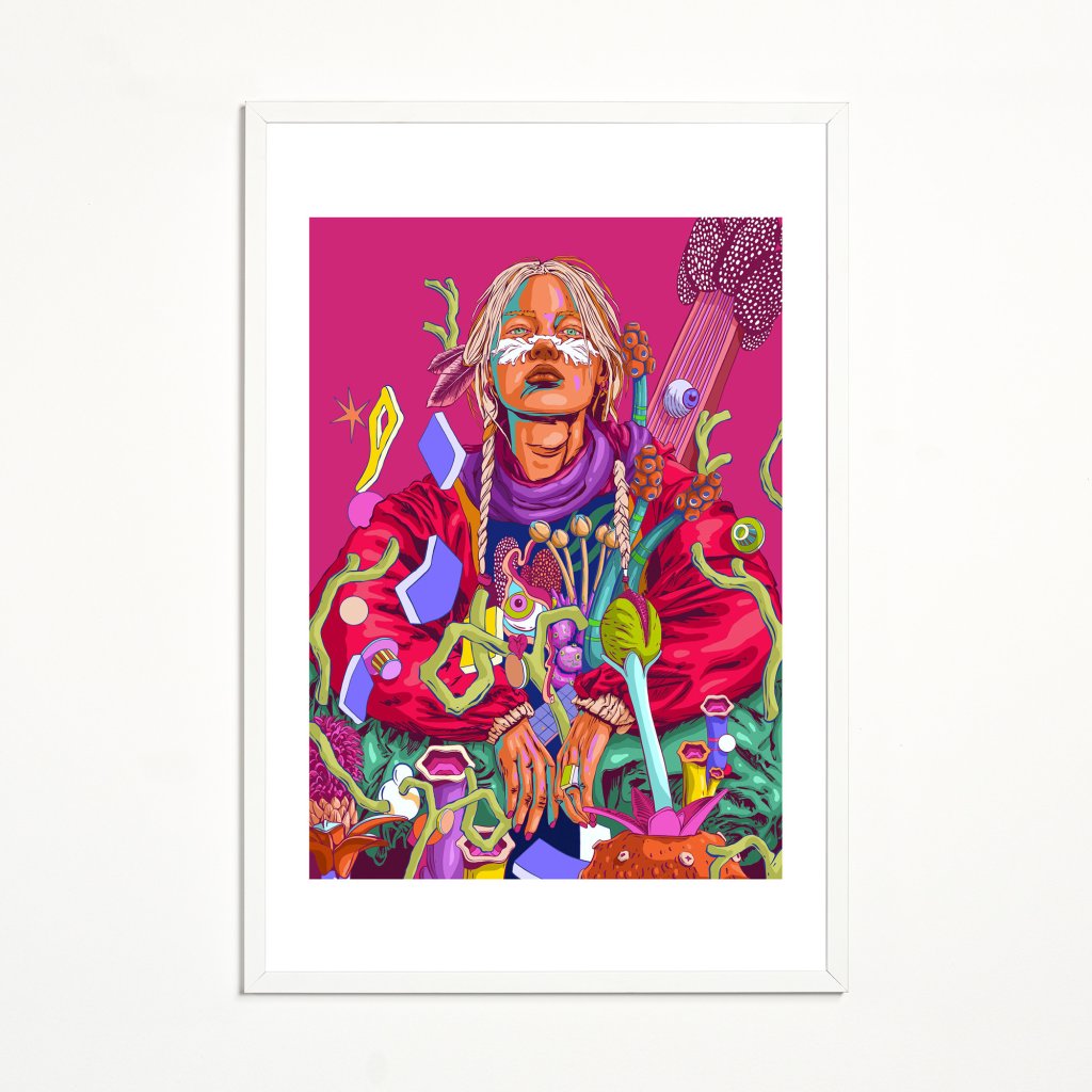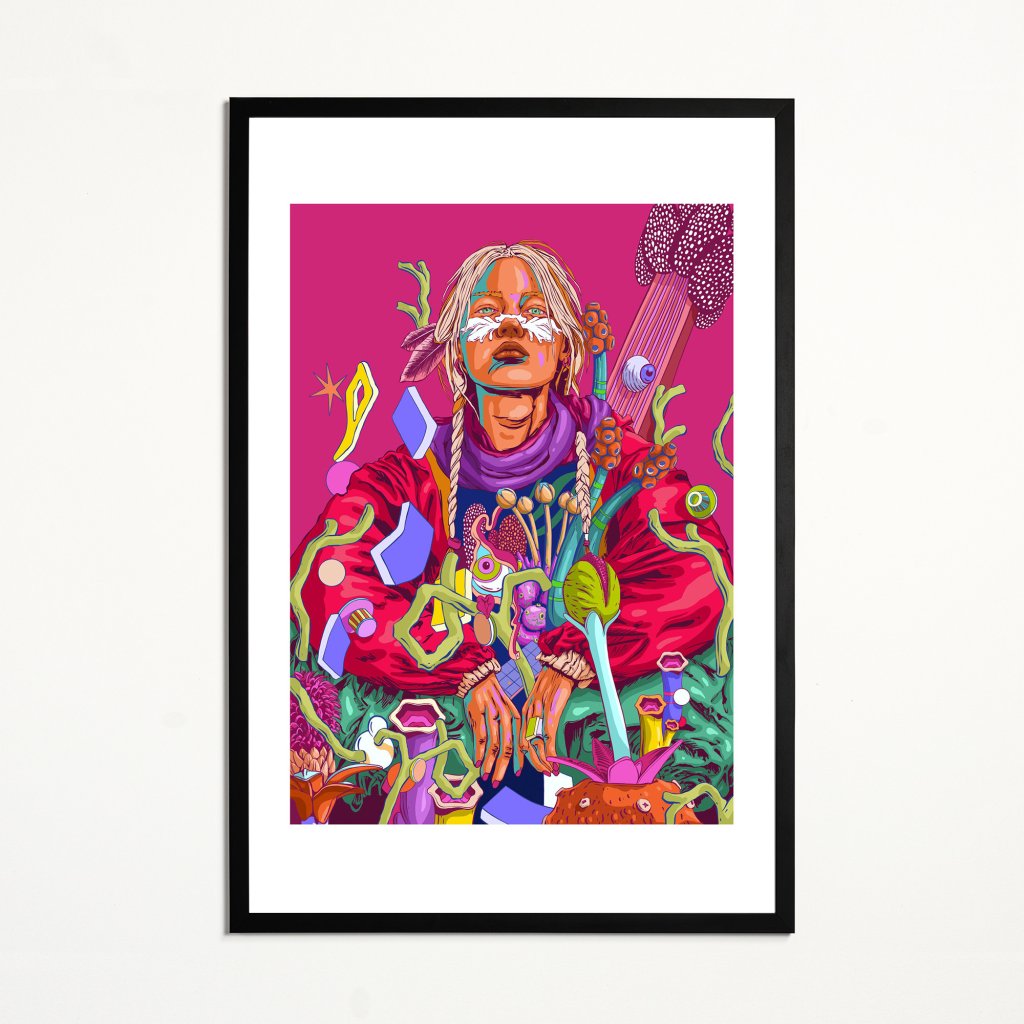Odvážná kompozice v dominantní purpurové, červené a tyrkysové barvě zachycuje ženu, která jako novodobá šamanka vládne surrealistické flóře kolem sebe. Každý detail, od pomalované tváře přes splétané copy až po fantastické rostliny a abstraktní levitující objekty, vypráví příběh o propojení starověké mystiky s futuristickou estetikou. Obraz je nabitý sebevědomím a klidnou silou, která přinutí diváka zastavit a zkoumat tento podivuhodný svět.