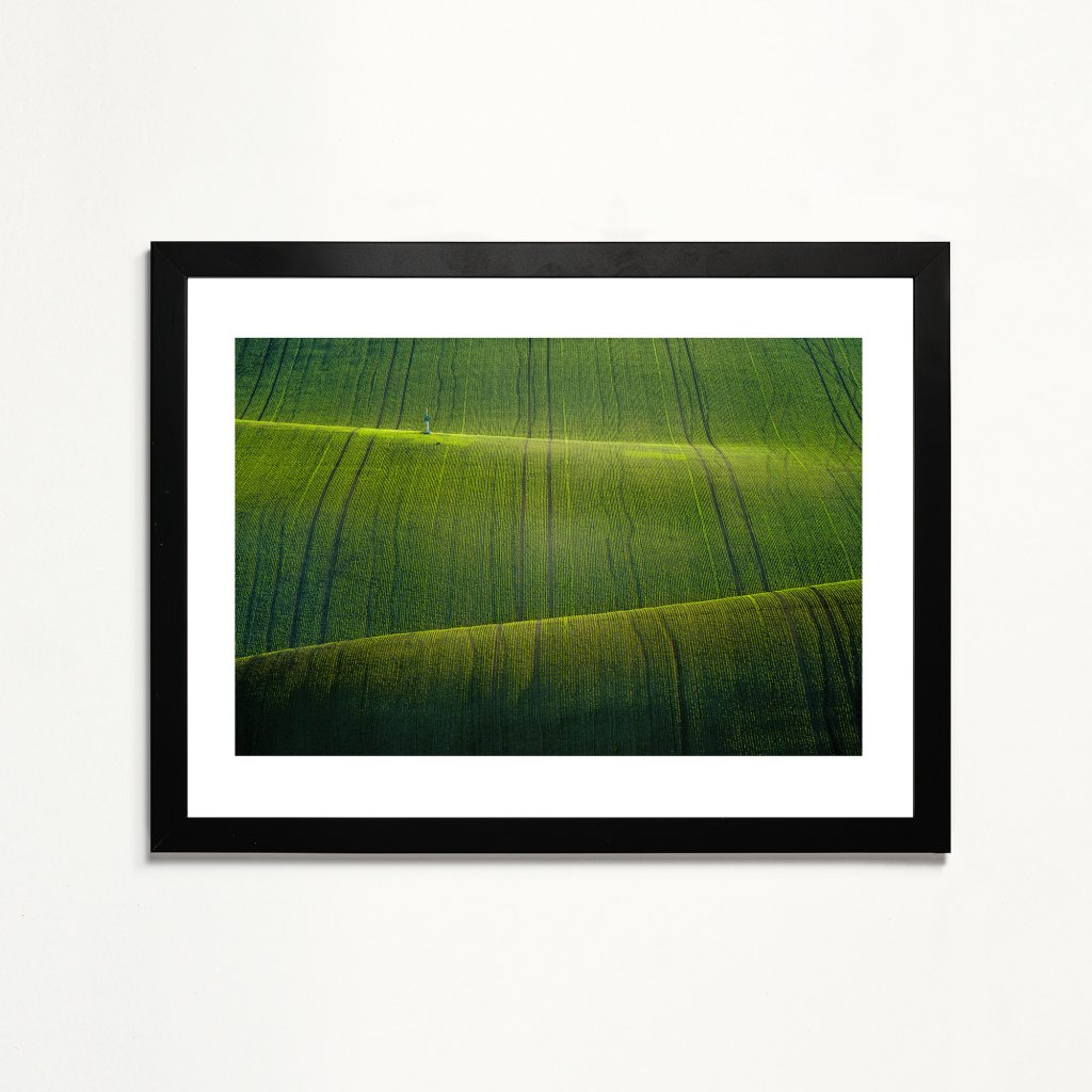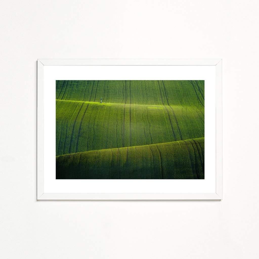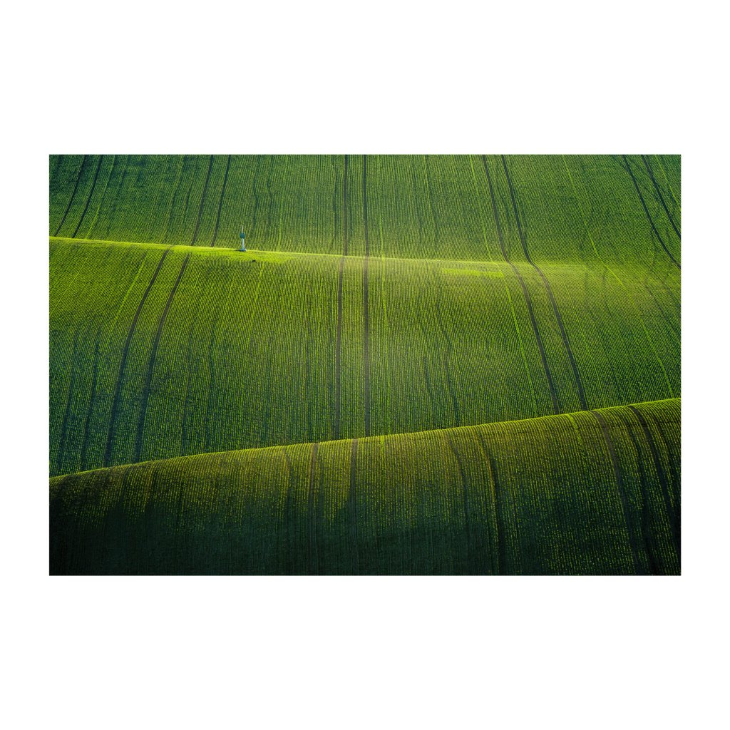 Mistrovská ukázka minimalismu v přírodě, kde se nekonečné linie polních brázd vlní v rytmu krajiny jako živoucí textura. Sytá, hluboká zeleň v popředí plynule přechází do jemnějších tónů, zatímco osamocený prvek kapličky dodává rozlehlému prostoru lidské měřítko a bod pro ukotvení pohledu. Fotografie vyzařuje absolutní klid a harmonii, což z ní dělá ideální doplněk do ložnic, relaxačních zón nebo kanceláří, kde potřebujete ulevit očím i mysli.