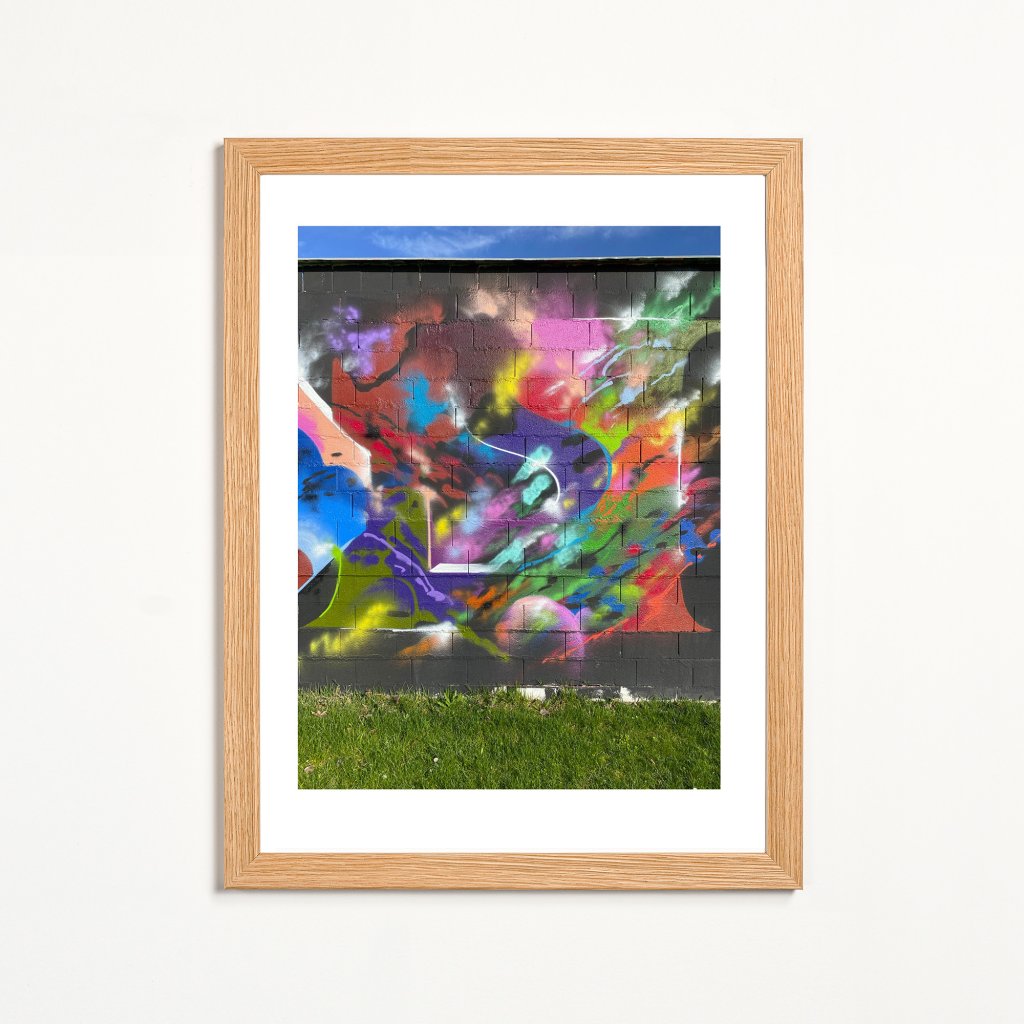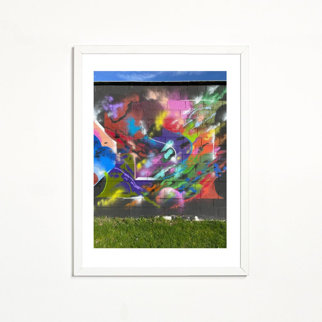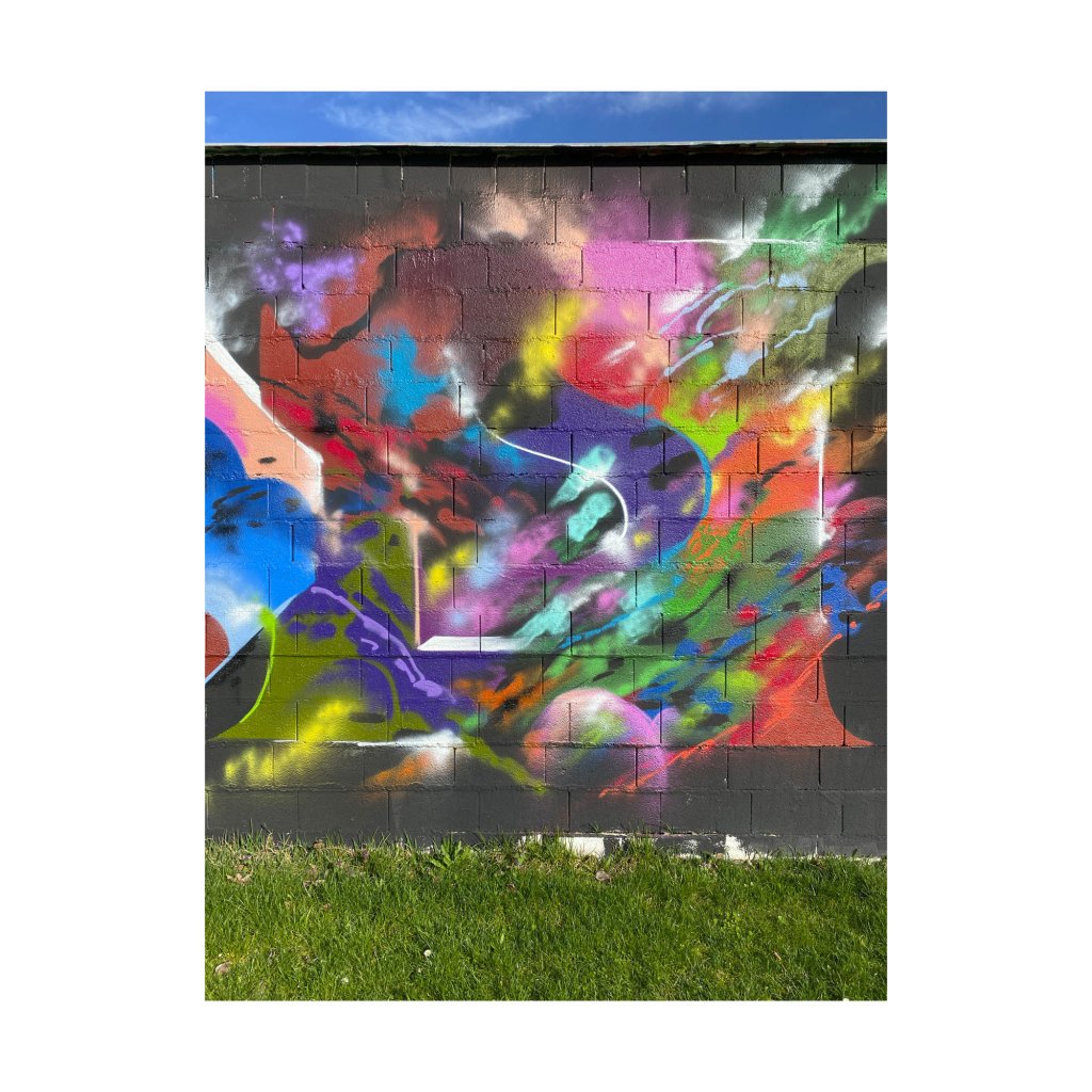 Na tmavém podkladu cihlové zdi září fosforeskující odstíny fialové, zelené a tyrkysové, které vytváří silný vizuální kontrast a hloubku. Abstraktní tvary se zde přelévají jako tekuté světlo, zatímco sprejové efekty dodávají kompozici měkkost a dynamiku. Dílo působí mysticky a zároveň velmi současně, evokuje atmosféru kyberpunku či nočních klubů, kde se mísí umělé osvětlení s temnotou. Ideální „statement“ pro herní místnosti, moderní bary nebo obývací prostory.
